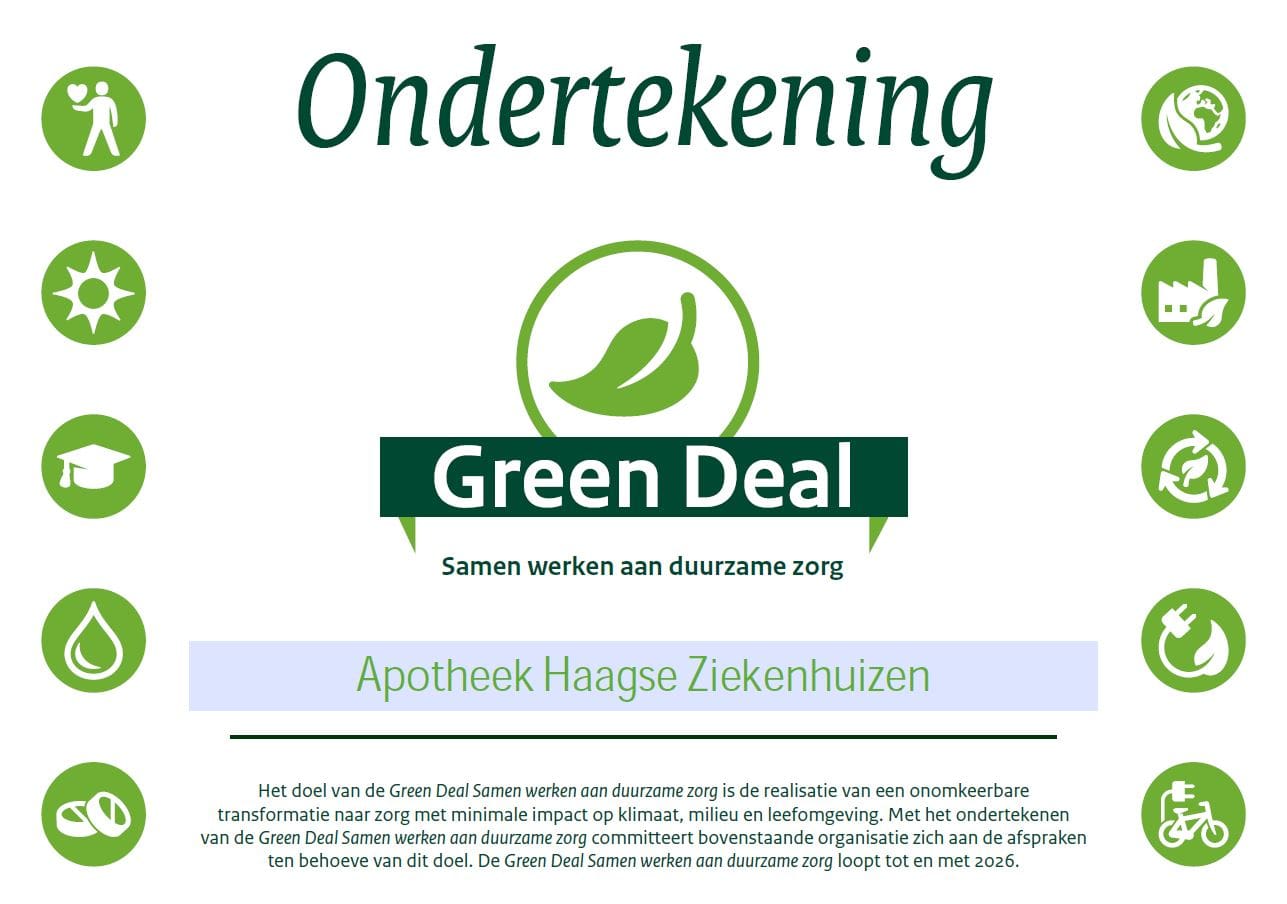 Onlangs hebben wij de Green Deal ‘Samen werken aan duurzame zorg’ ondertekend. Hierin staan afspraken tussen de Rijksoverheid en andere partijen om duurzame plannen uit te voeren. De Green Deal ‘Samen werken aan duurzame zorg’ wordt gefaciliteerd door het ministerie van Volksgezondheid, Welzijn en Sport en gedragen door de zorgsector.